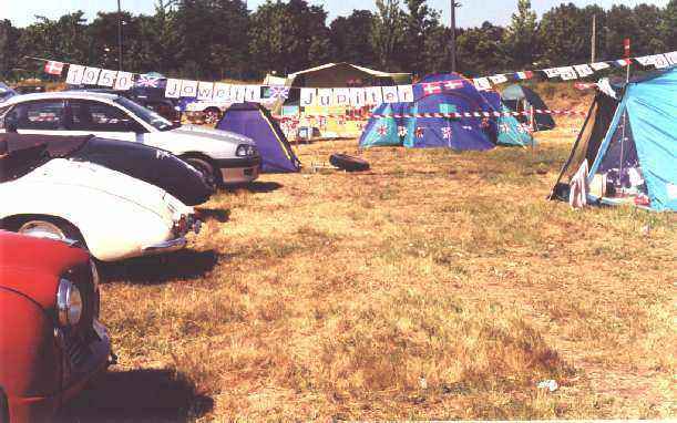 Le Mans campsite. Nose of a red Jupiter, tails of two more Jupiters, and the banner prepared by Ib Rasmussen to mark the Anglo-Danish site.